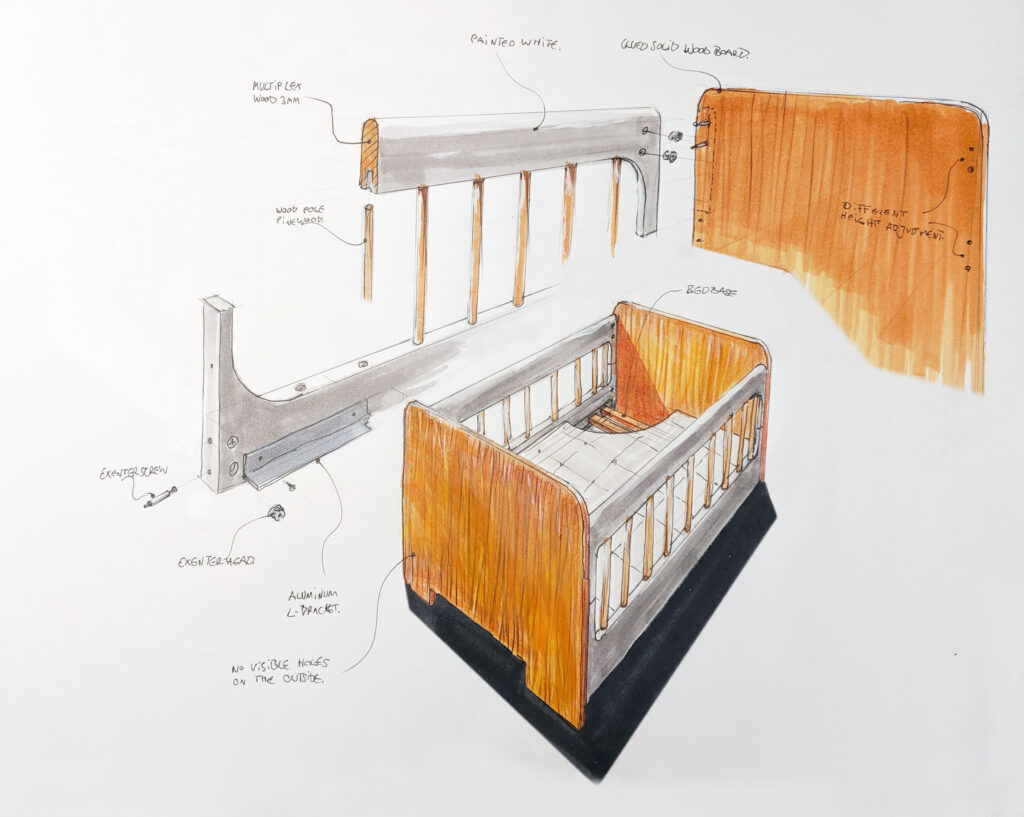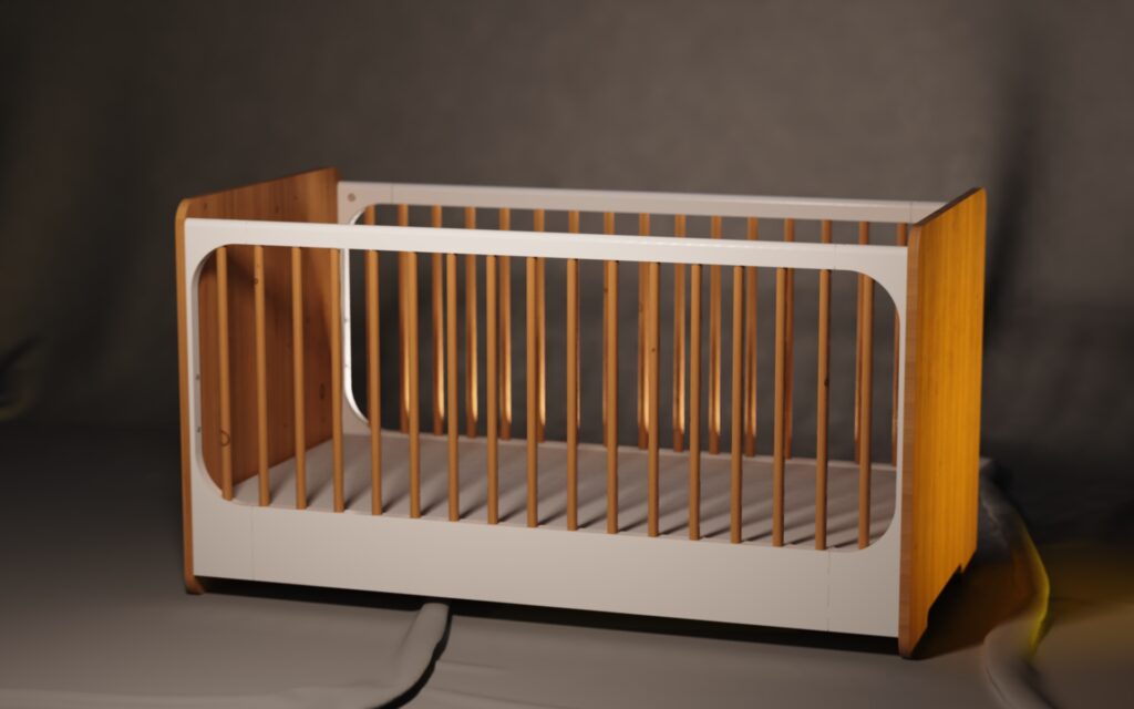 Developed in response to outdated, overly playful or purely functional baby beds, the aim was to create a timeless piece that integrates into contemporary interiors while addressing real family needs: safety, clarity, and long-term usability.