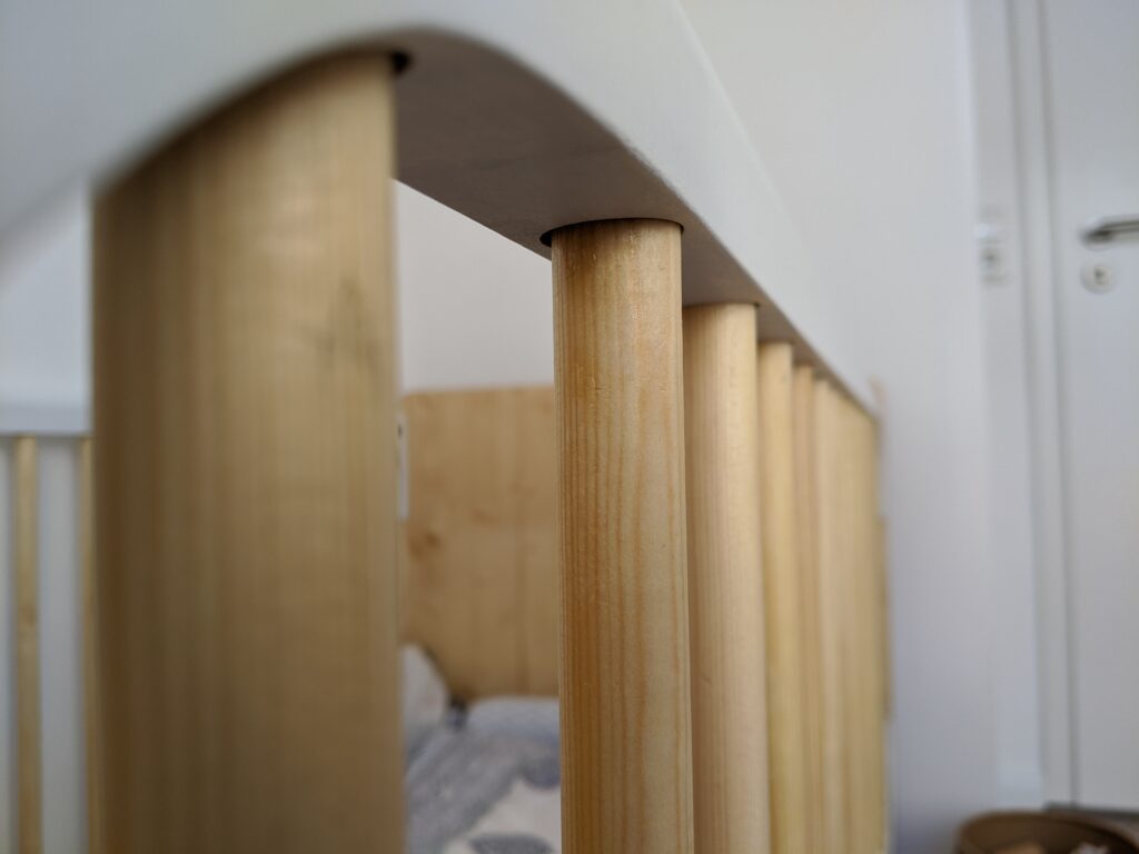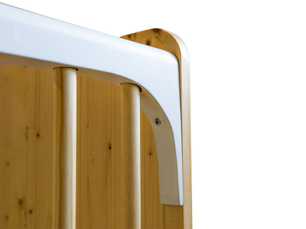 The construction eliminates visible exterior fittings. Clean geometry, soft edge transitions, and warm materials allow the bed to function beyond the nursery as a lasting furniture piece.
