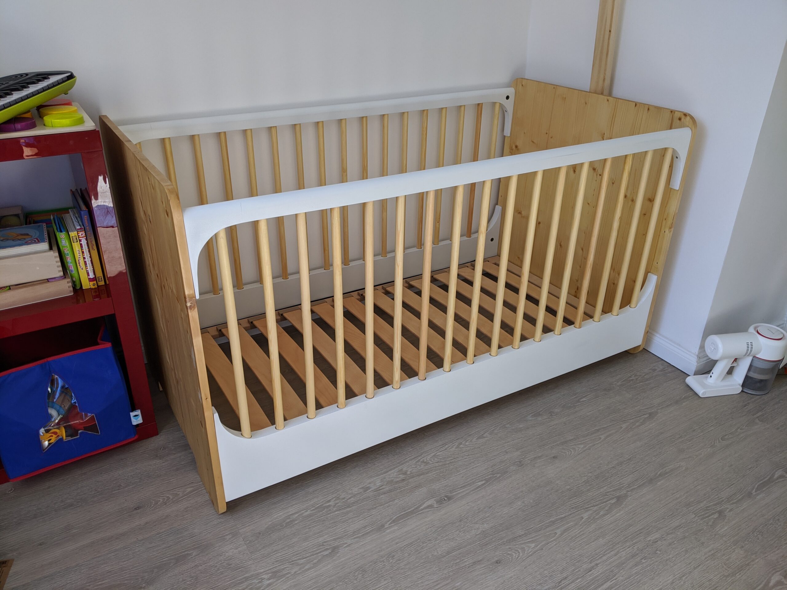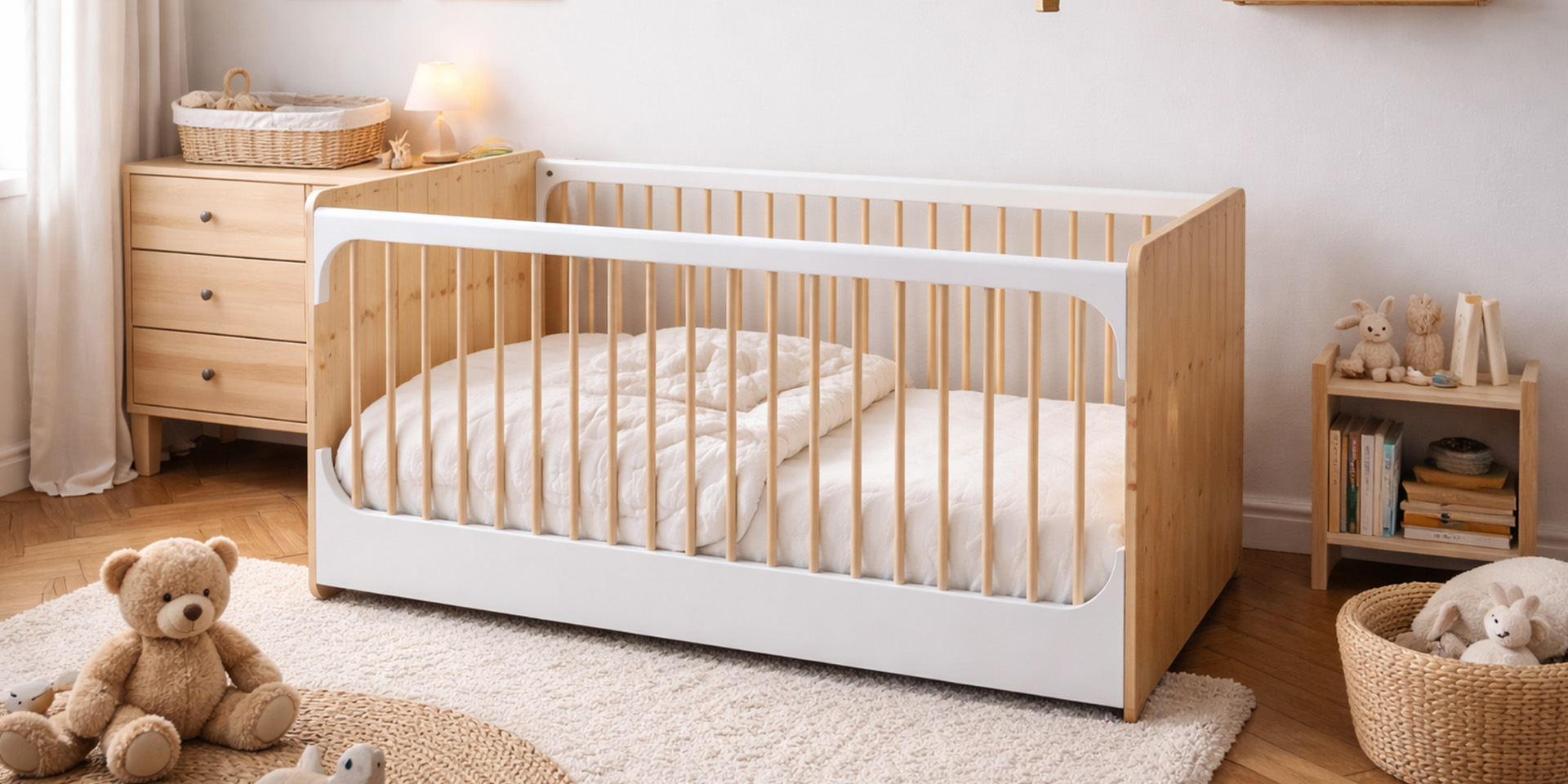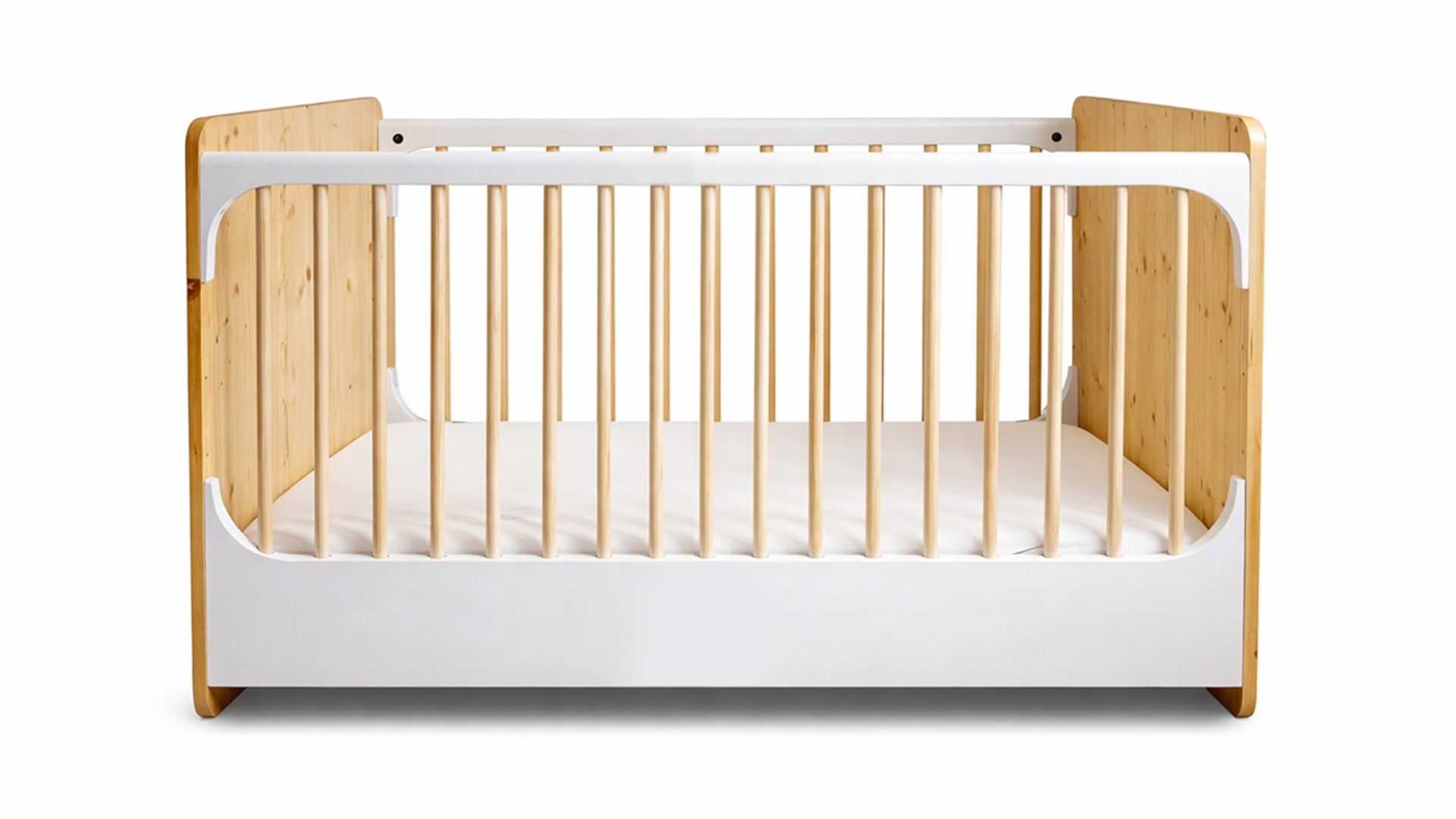 A solid wood baby bed defined by simplicity and adaptability.
