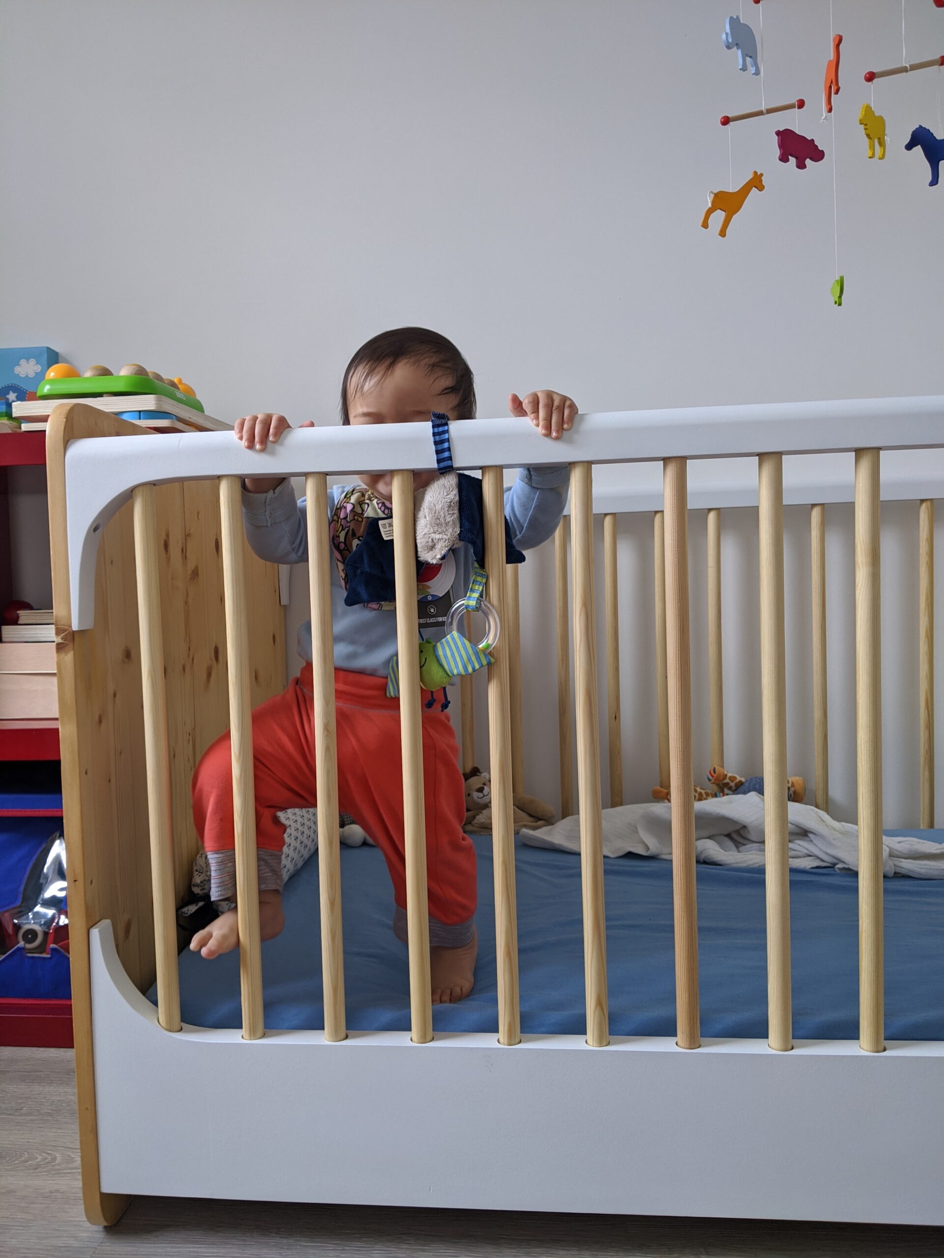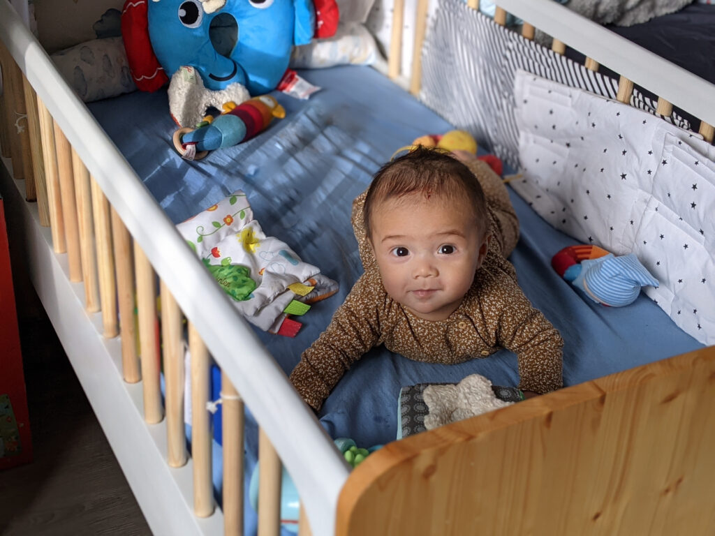 Two height levels structure its use: an elevated position for the newborn phase with soft textile side panels creating enclosure, and a lowered position for the standing phase with removable bars for gradual transition.