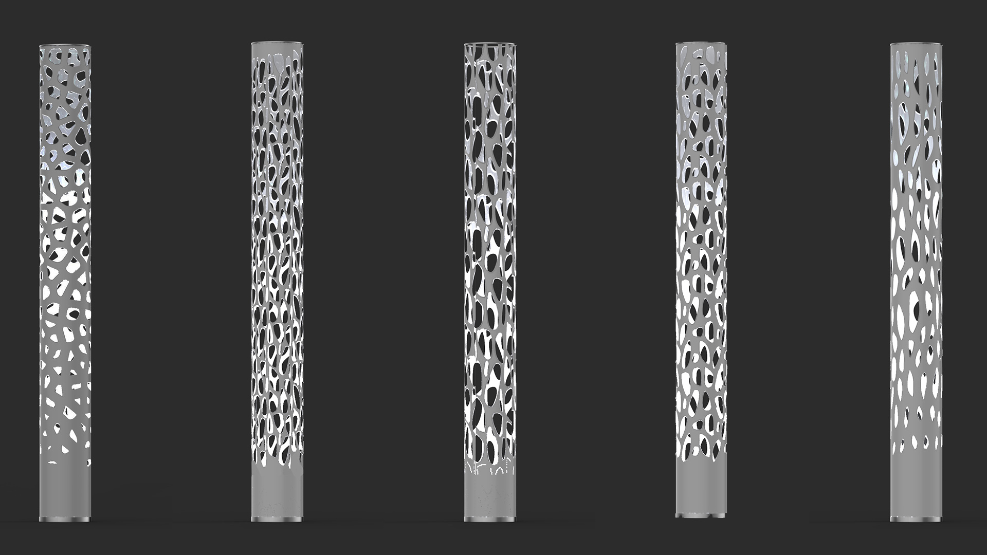 Inspired by plant cell structures, the pattern was developed parametrically as a Voronoi system with a vertical falloff — smaller cells at the base, gradually expanding upward. This gradient gives the lamp visual tension and spatial rhythm.