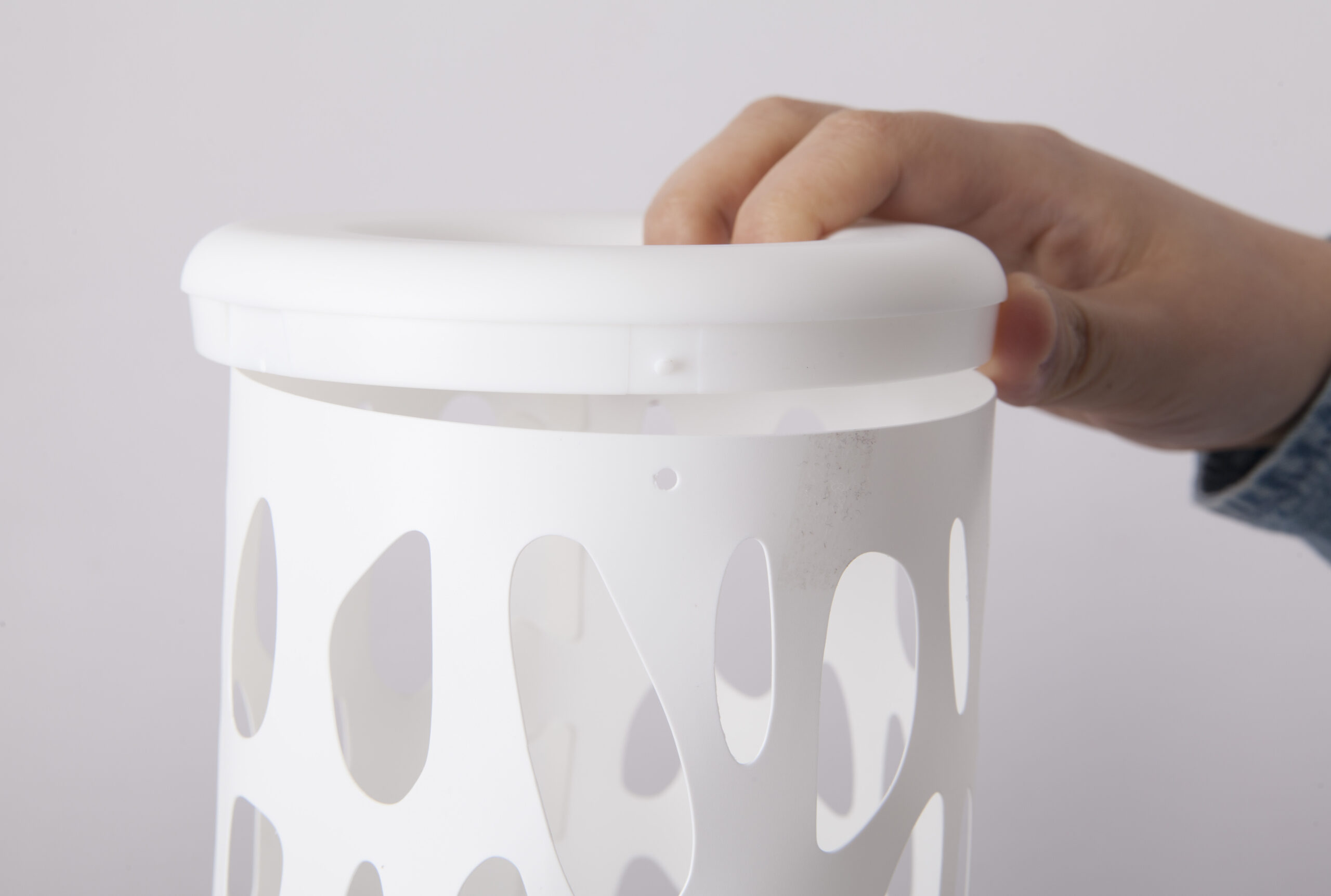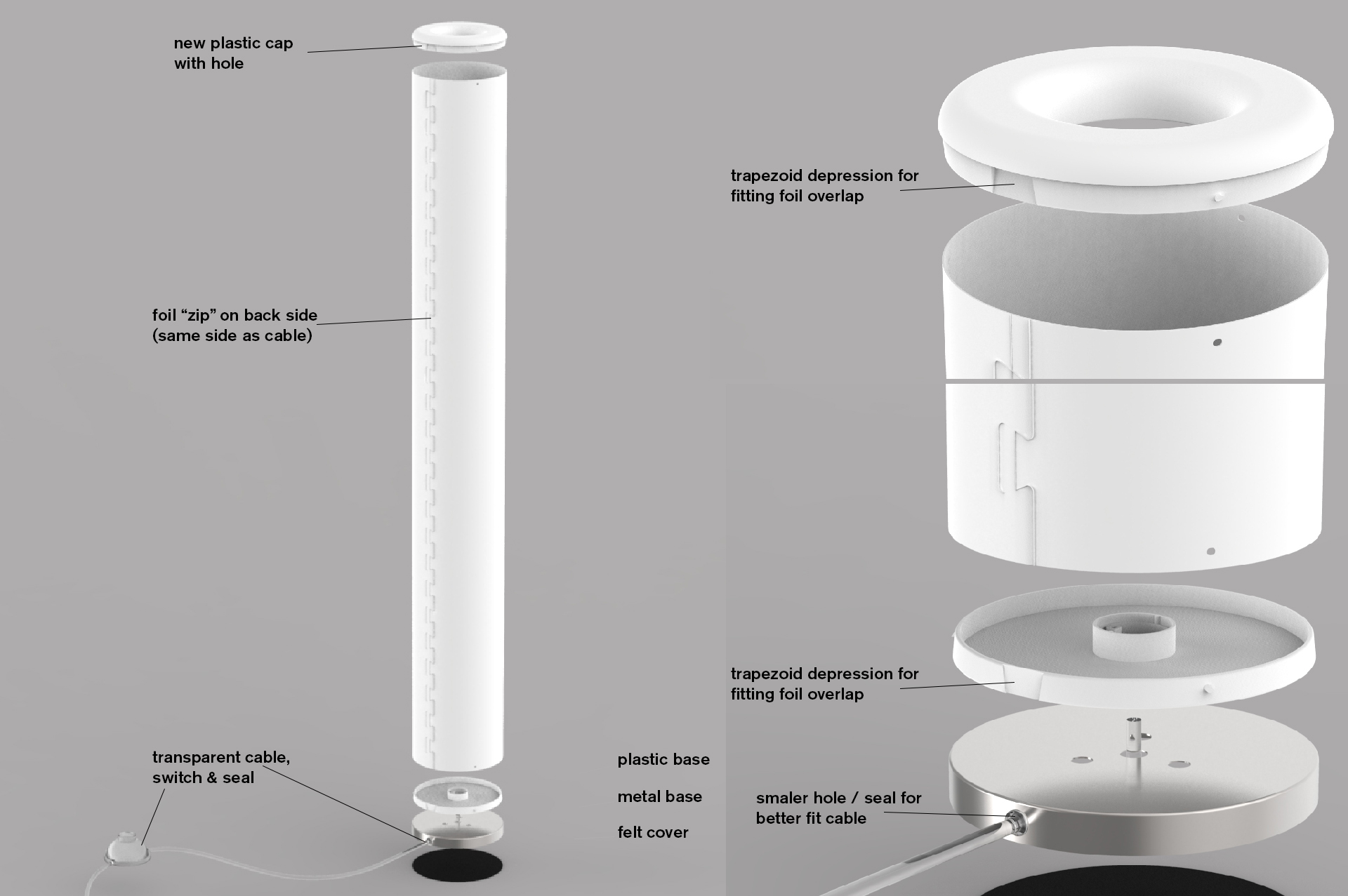The Organic Foil Lamp is formed from a single punched polypropylene sheet that is rolled and interlocked to create a cylindrical volume. Plastic caps stabilize the structure while maintaining material efficiency and flat-pack logic.
