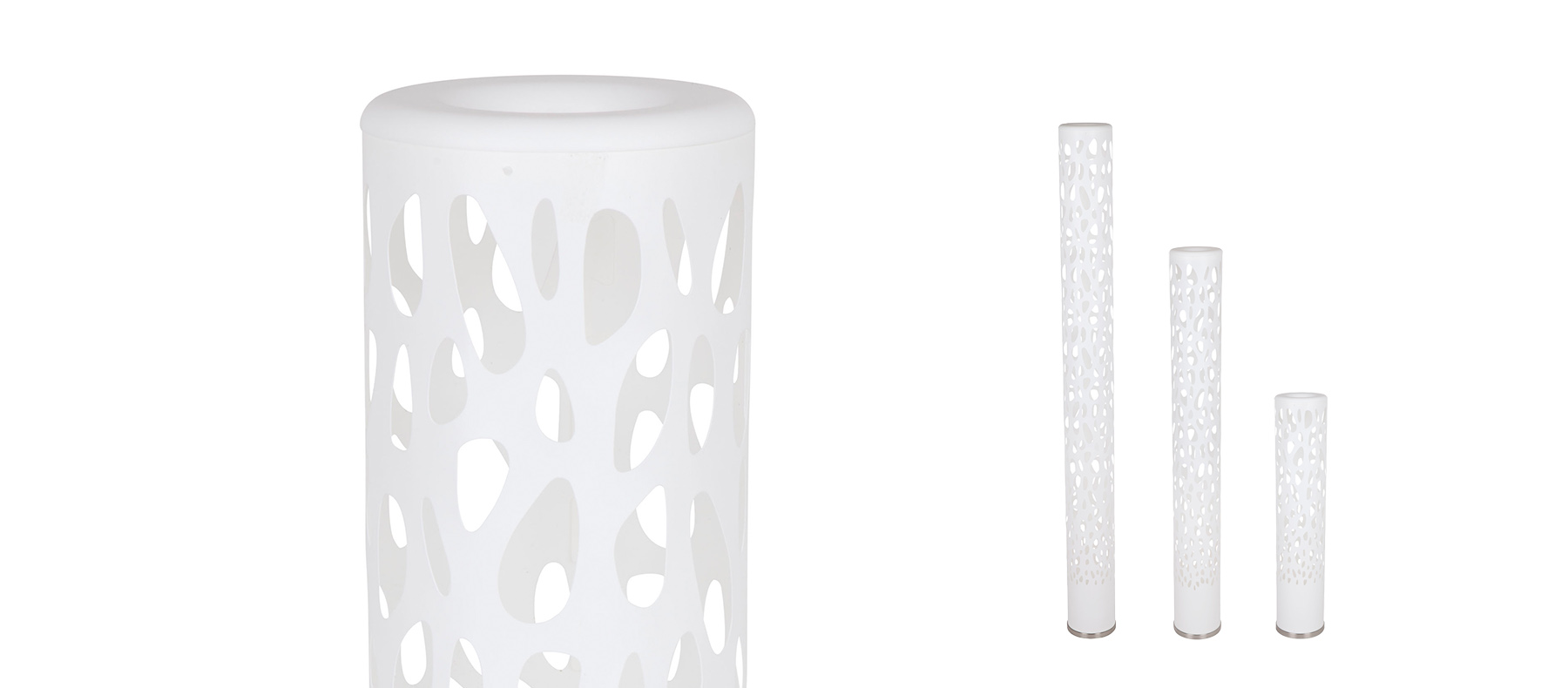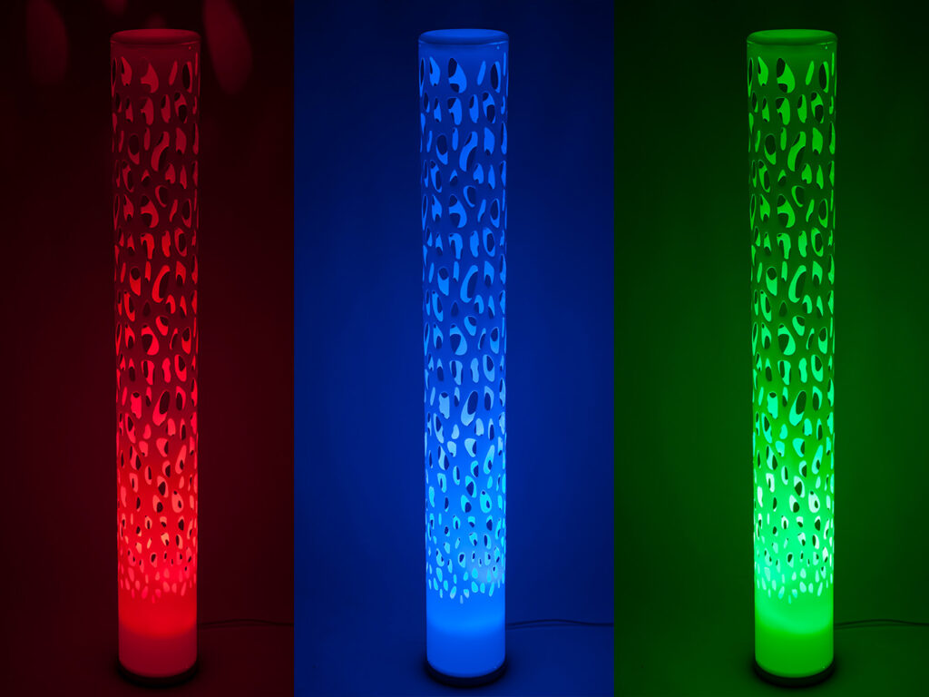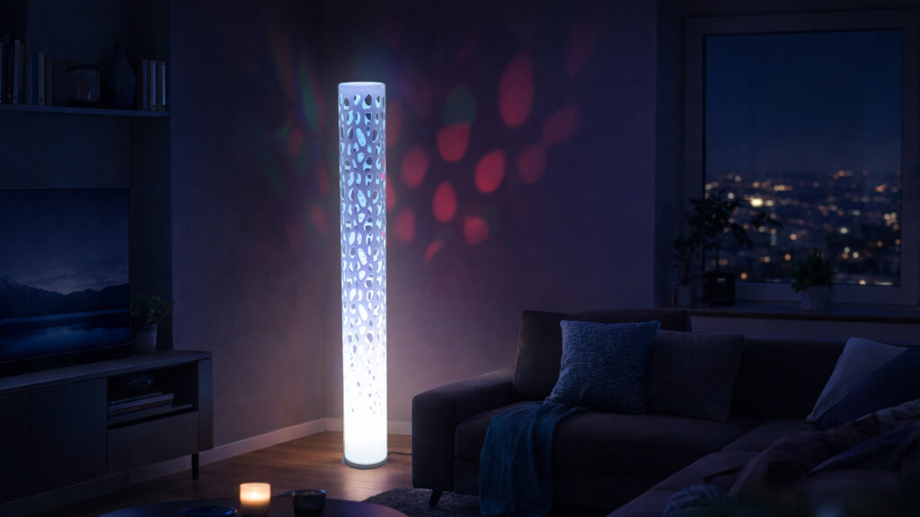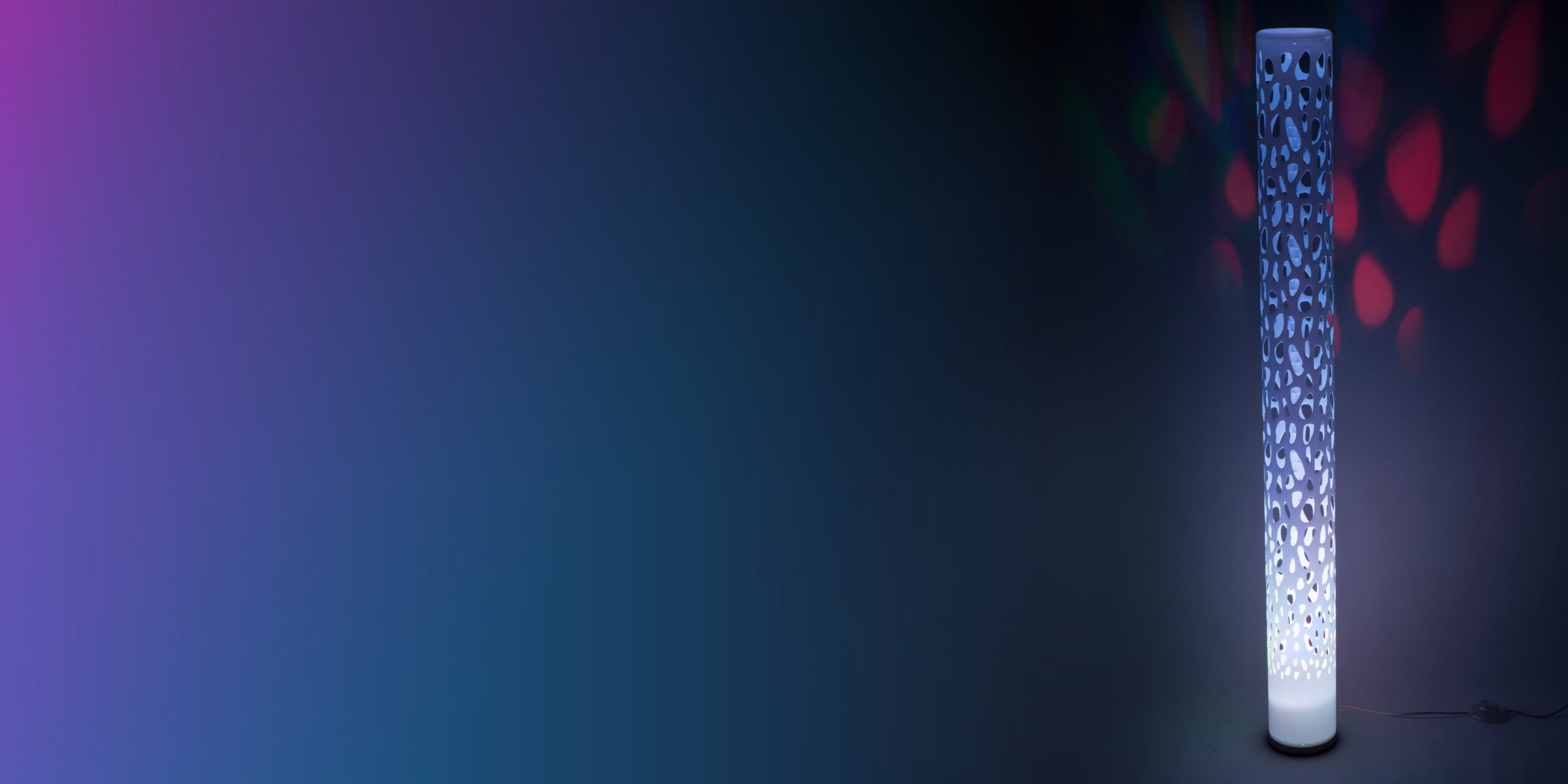 Its defining feature is the perforation pattern. Light passes through the openings to project dynamic shadows into the surrounding space, while the translucent foil creates a soft ambient glow. RGB GU10 bulbs allow atmospheric variation.