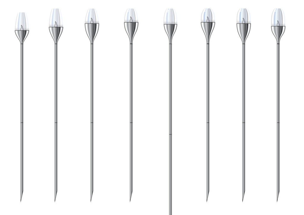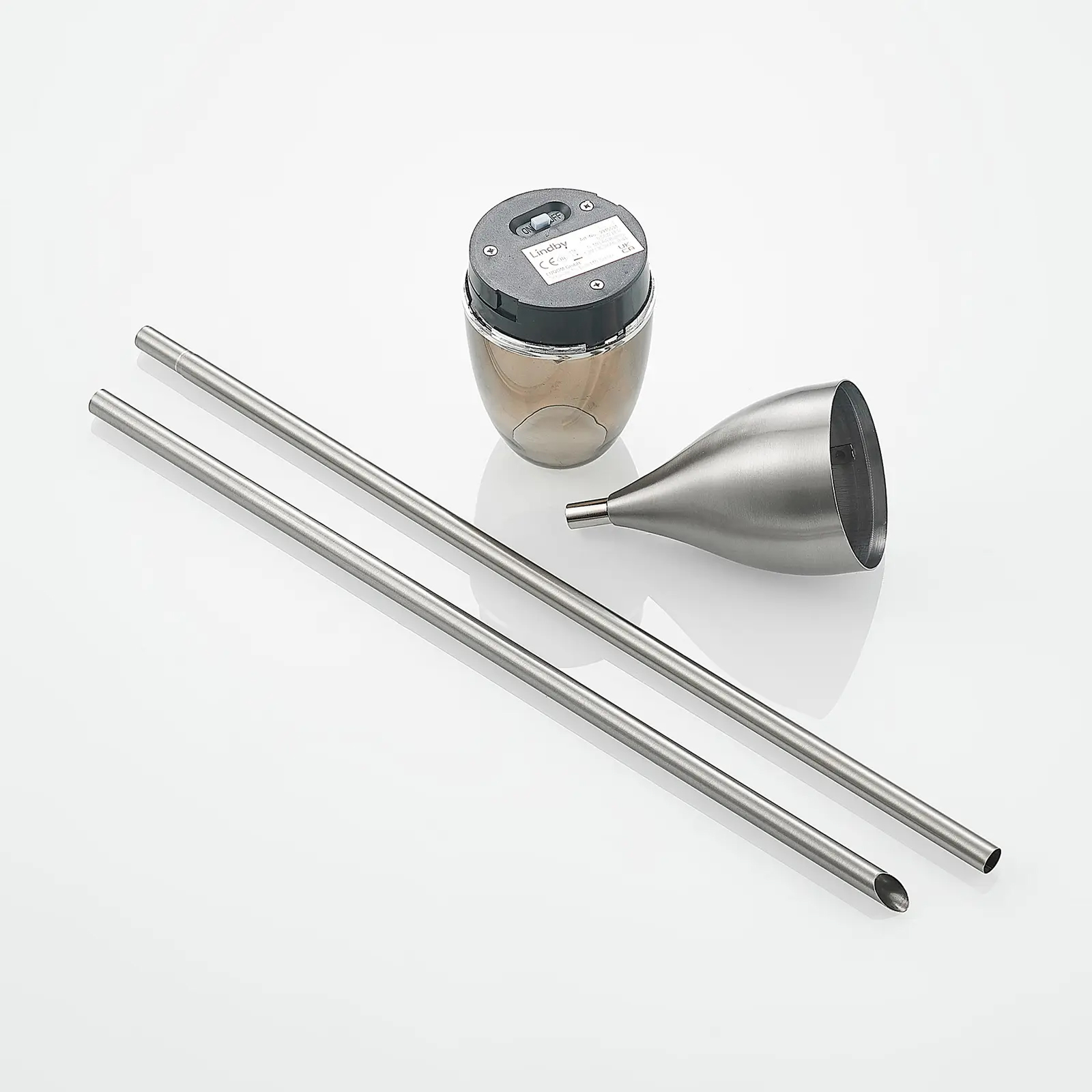 A transparent diffuser controls light diffusion and optical depth, while the stainless steel body establishes a balanced vertical proportion. The two-part pole and detachable head reduce shipping volume and support both flat packaging and pre-mounted retail display.