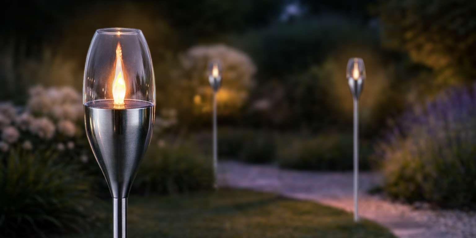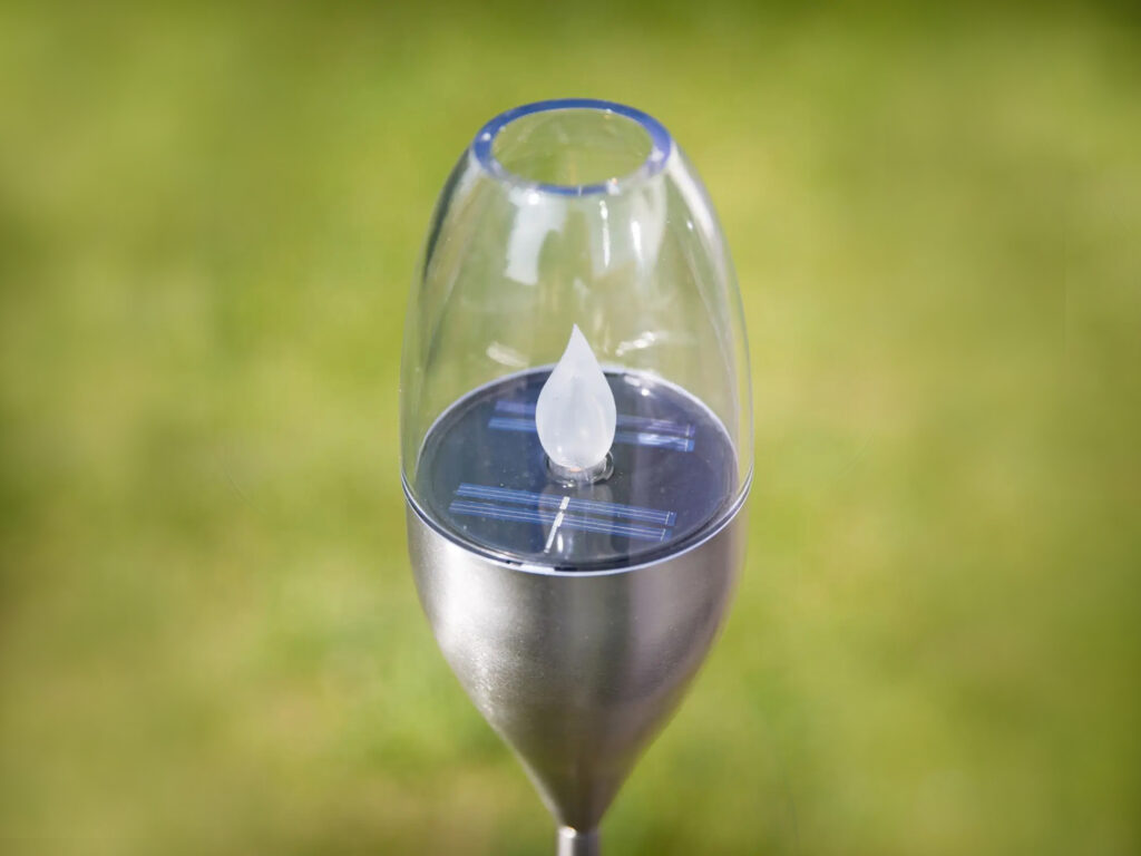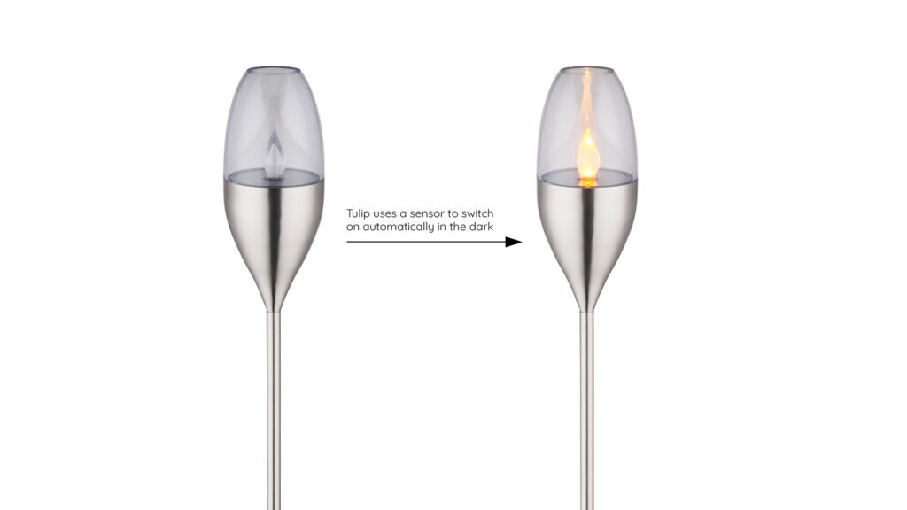 Tulip integrates flickering LED, rechargeable battery, solar panel, and dusk–dawn sensor into a compact head unit that operates autonomously.